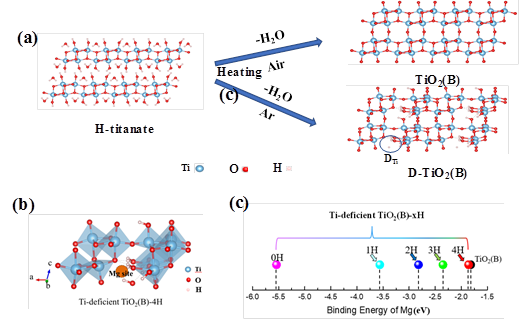 (a)阳离子Ti缺陷TiO2(B)的合成过程,(b)Ti缺陷位置与Mg结合的构型图,(c) 不同数量质子补偿电荷的 Ti缺陷TiO2(B)与Mg的结合能