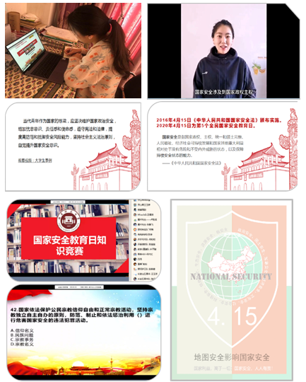 地理科学学院利用“云班会”组织全体学生同上《总体国家安全观视角下的疫情防控》公开课;开展国家安全教育基本知识宣讲和线上话题接力讨论;举行国家安全知识竞赛;制作“传扬国家安全理念”微视频。