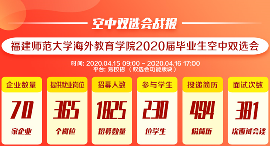 415日至16日,海外教育学院2020届毕业生空中双选会顺利举行。本次线上双选会通过“易校招大学生就业平台”开展,共有来自全国各地的70家企事业单位参加选聘,包括福州理工学院、泉州聚龙外国语学校、北京中公教育、福建瑞维光电等,提供就业岗位365个。本次空中双选会共吸引院内外230位毕业生投递简历494份,开展线上面试381次。