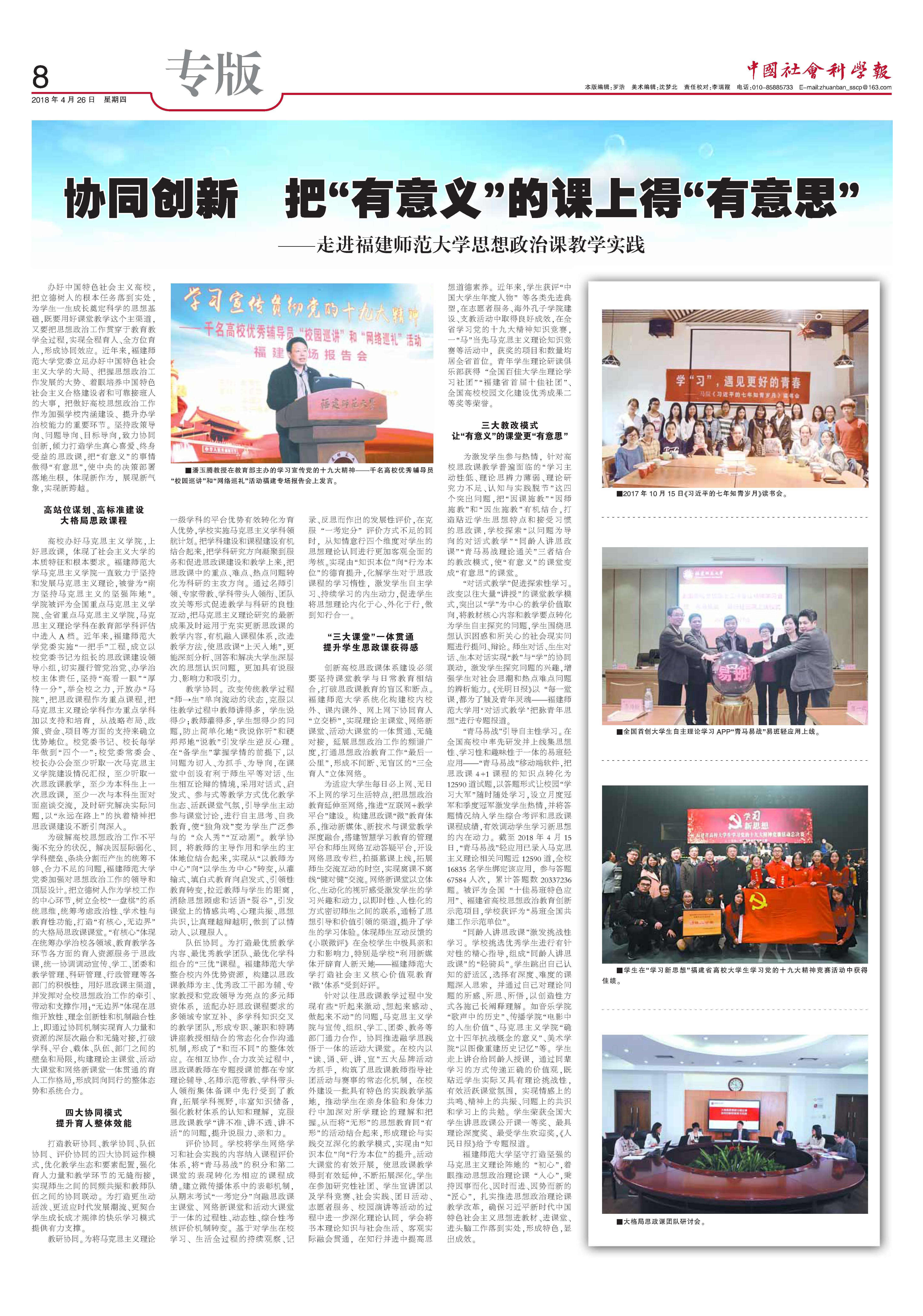 4月26日,《中国社会科学报》以《协同创新 把“有意义”的课上得“有意思”——走进必一在线平台(中国)官网思想政治课教学实践》为题,深度报道了必一在线平台(中国)官网把做好高校思想政治工作作为加强学校内涵建设、提升办学治校能力的重要环节,坚持政策导向、问题导向、目标导向,致力协同创新,倾力打造学生真心喜爱、终身受益的思政课,把“有意义”的事情做得“有意思”,努力培养能够担当民族复兴大人的时代新人。该文章从高站位谋划、高标准建设大格局思政课程,四大协同模式提升育人整体效能,“三大课堂”一体贯通提升学生思政课获得感,三大教改模式让“有意义”的课堂更“有意思”等角度详细介绍了必一在线平台(中国)官网的具体做法。