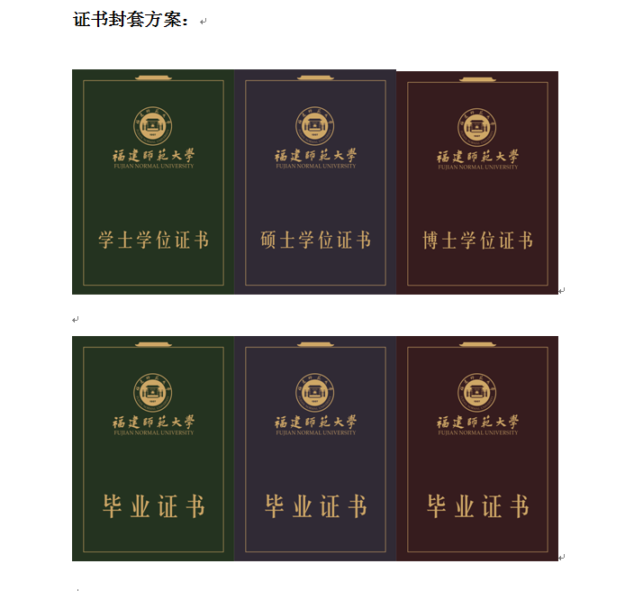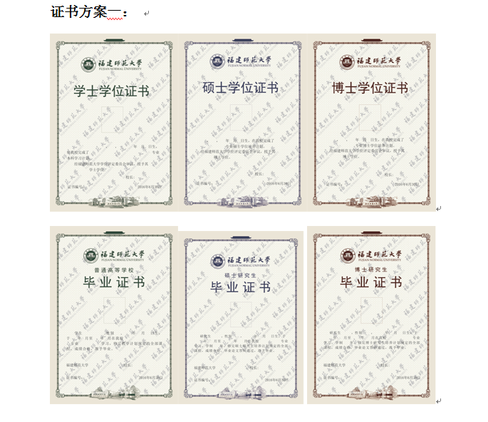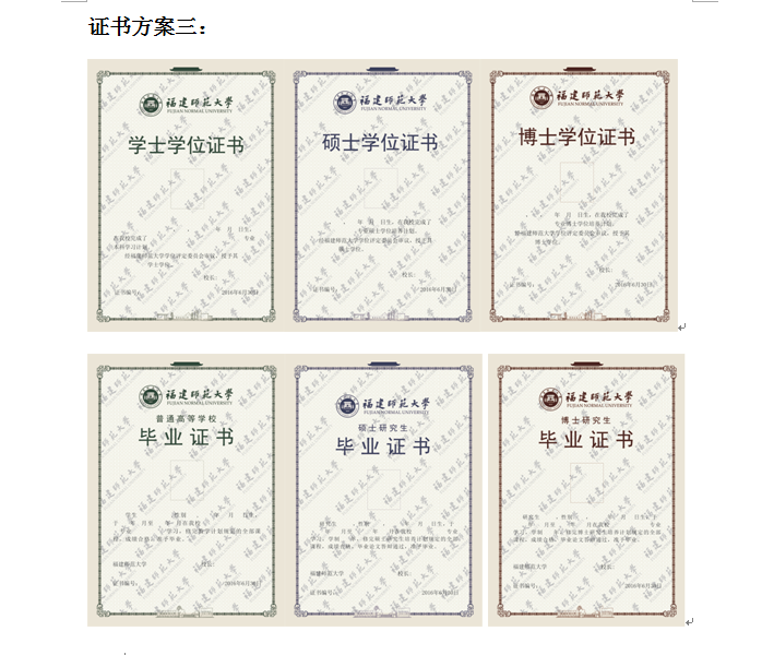 三套方案的区别在于证书底部图案的不同。第一套为旗山校区、仓山校区校门钢笔画,第二套无图案,第三套为抽象简化的旗山校区、仓山校区校门钢笔画。