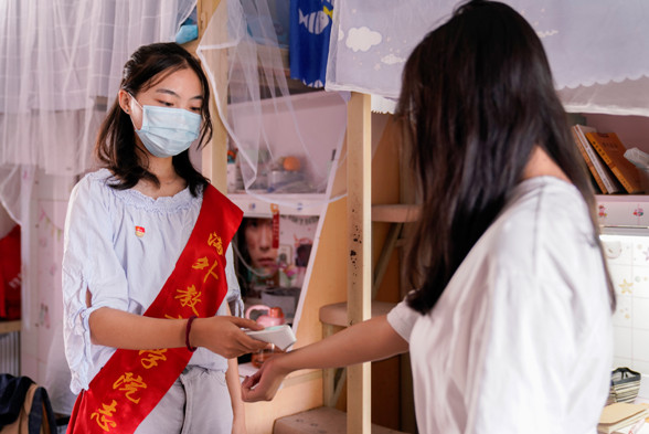 宿舍楼大厅里,体温监测队负责宿舍楼栋体温监测任务,在桃苑9号楼、桂苑10号楼、青年教师公寓2号楼入楼处设置体温监测点,摆放防疫物资,全天实时记录入楼人员体温情况,做到有异常及时上报、及时处理。体温监测队队员还肩负每一位同学“早、中、晚”体温测量与监督,严格把控疫情防控的第一道防线。体温监测队成员史夷秀表示,作为预备党员,在疫情考验面前,更要挺身而出,发挥先锋模范作用,主动担当,从一件件小事做起,筑牢防疫屏障。