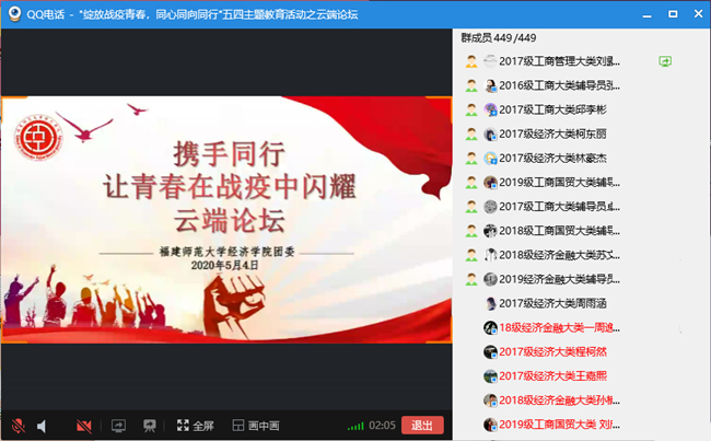 5月4日下午,经济学院举行“携手同行,让青春在战疫中闪耀”五四主题教育云端论坛活动。论坛分为线下主会场和线上分会场,院党委副书记颜隆忠、团委书记许琛、各年级辅导员齐聚线下主会场;各年级青年团员代表通过QQ屏幕分享参与线上分会场,全院共计400余人参加活动。