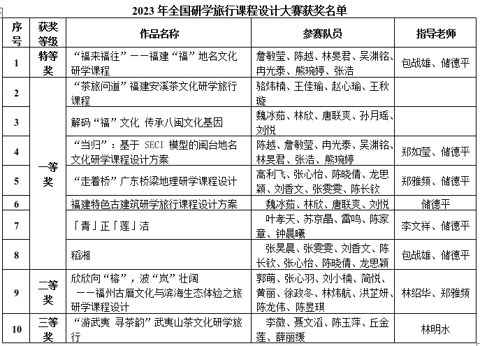 近日,由《中学地理教学参考》《地理教学》《地理教育》三大地理教育类期刊联合主办的“2023年全国研学旅行课程设计大赛”评奖结果揭晓。必一在线平台(中国)官网文化旅游与公共管理学院学子的10件参赛作品全部获奖,其中特等奖1项、一等奖7项、二等奖1项、三等奖1项,文化旅游与公共管理学院获优秀组织奖。