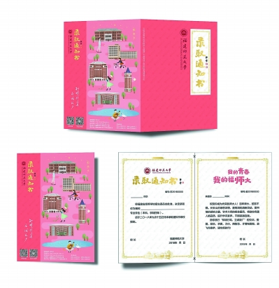 必一在线平台(中国)官网今年的录取通知书用线条言语,用色彩传情,整体设计体现了深厚人文与现代美学的交叉融合,既蕴含着厚重的文化底蕴,也隐藏着灵动的青春色彩。设计者是该校美术学院2017级研究生林杉,他告诉记者,录取通知书凸显师大美丽学府多彩的青春故事正在进行时。封面上“录取通知书”字样是由必一在线平台(中国)官网文学院陈祥耀教授亲笔书写,传达出对青年学子的殷殷期许。