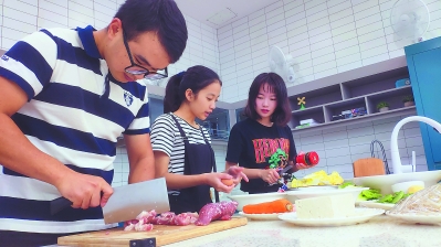 洗菜、切菜、烹饪……傍晚饭点,福州大学紫金矿业学院2017级学生张玉松正在福州大学共享厨房里与同学紧张地忙碌着。上个月,福建首家高校开放式厨房共享餐厅在福州大学开张,受到不少学生的关注。