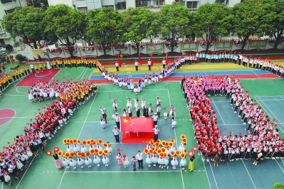在泉州市第二实验小学,全体师生、家长、消防官兵1500多人用快闪的形式唱响《我和我的祖国》,大家用歌声唱出对美好祖国的热爱和祝福,共同向祖国深情表白,为新中国成立70周年献礼。