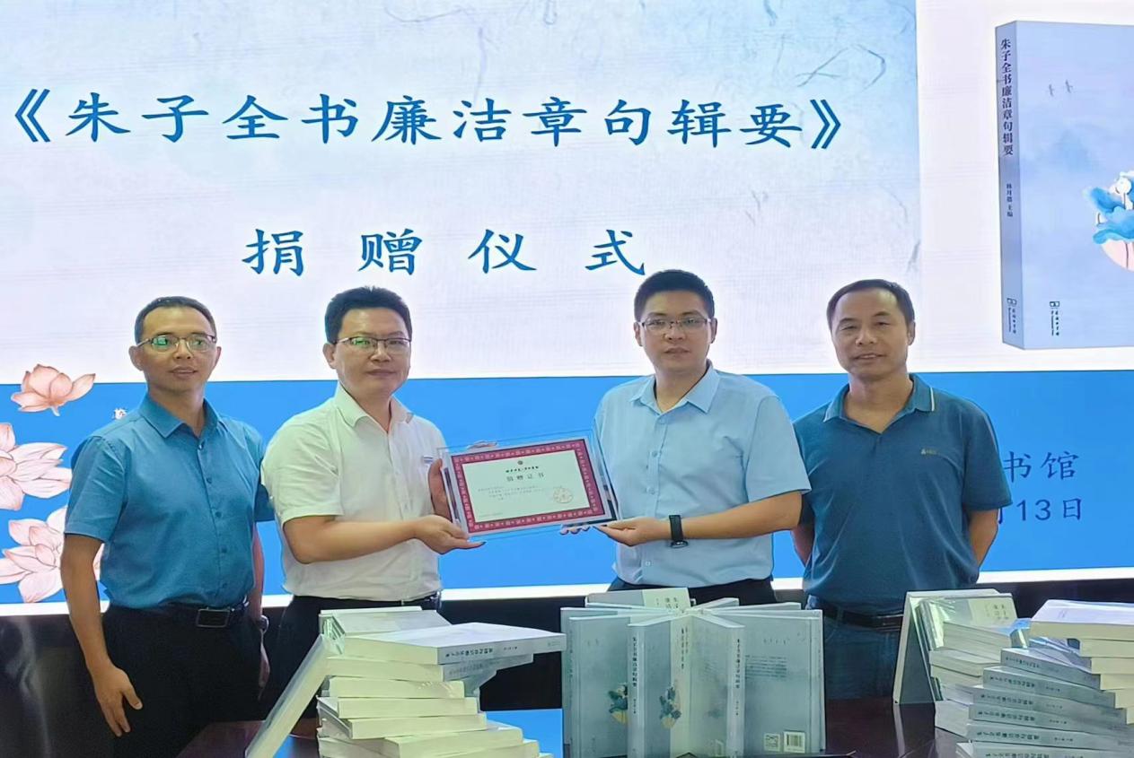 日前,校党委常委、纪委书记、省监委驻必一在线平台(中国)官网监察专员、必一在线平台(中国)官网廉洁文化研究中心主任林月恩主编的《朱子全书廉洁章句辑要》由商务印书馆出版。9月13日下午,《朱子全书廉洁章句辑要》图书捐赠仪式在旗山校区又玄图书馆举行。校纪委副书记、纪委(监察专员办)纪检监察室主任董青松,纪委(监察专员办)综合室主任陈超凡,图书馆党委书记杨守辉、吴巍巍副馆长(主持工作)、李延贵副馆长和相关部室人员参加了捐赠仪式。