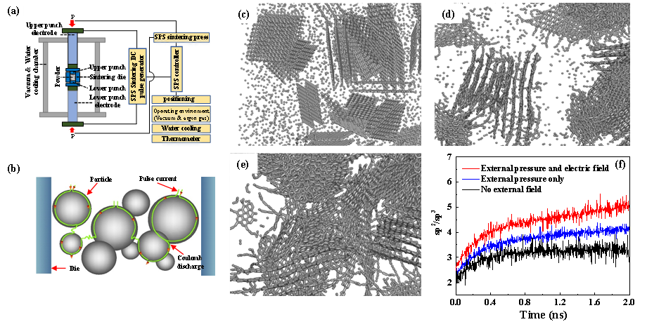 SPS设备及加热机制图及其快速炭化的分子动力学模拟图