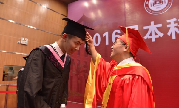 典礼第二阶段,校领导王长平、叶燊、凌启淡分别为全体毕业生执行了“拨穗礼”,并一一合影留念。