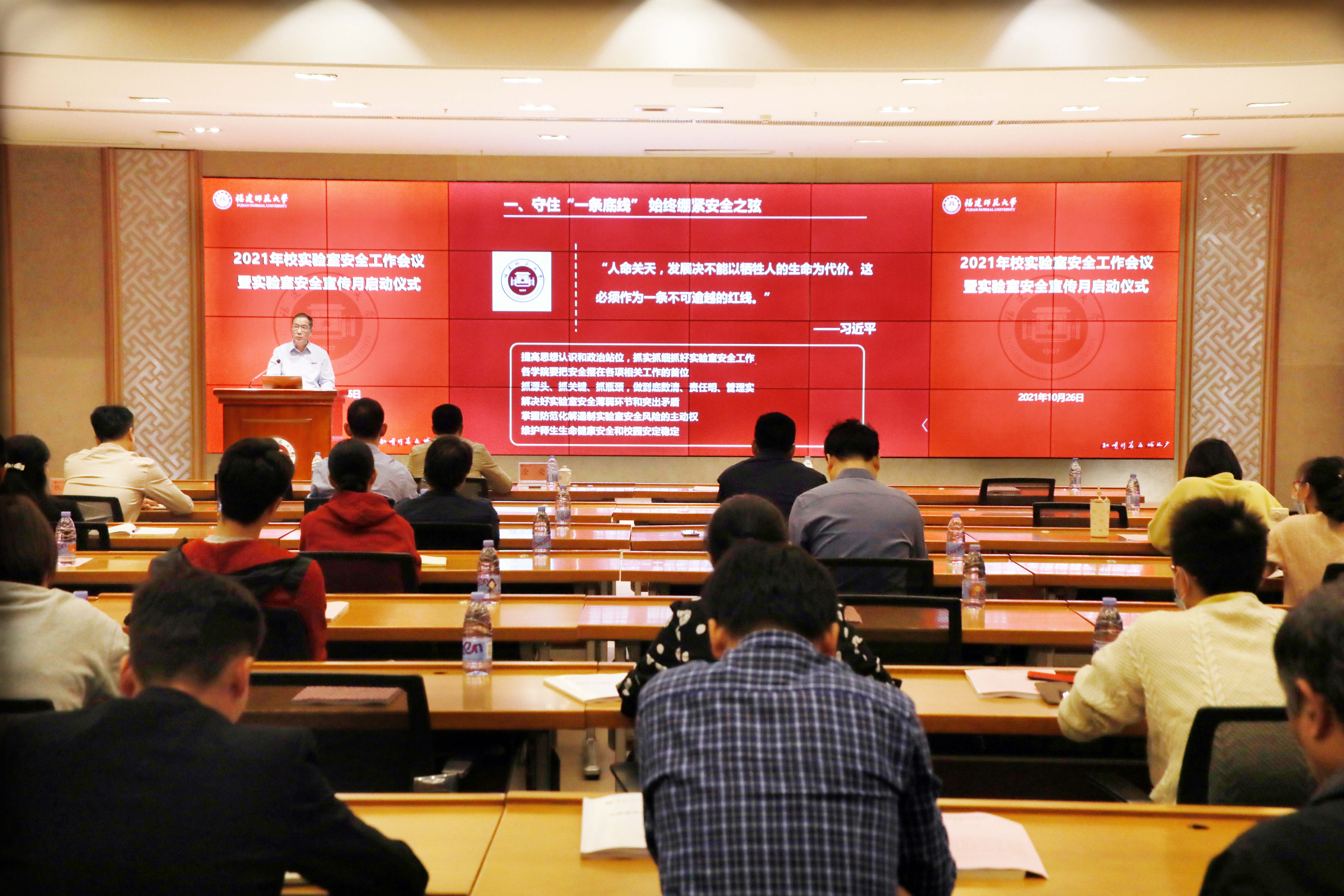 会议于10月26日在旗山校区宏达厅举行。校长王长平、副校长涂荣,相关职能部门主要负责人,有关单位分管实验室安全工作负责人、实验室安全管理人员参加了会议。