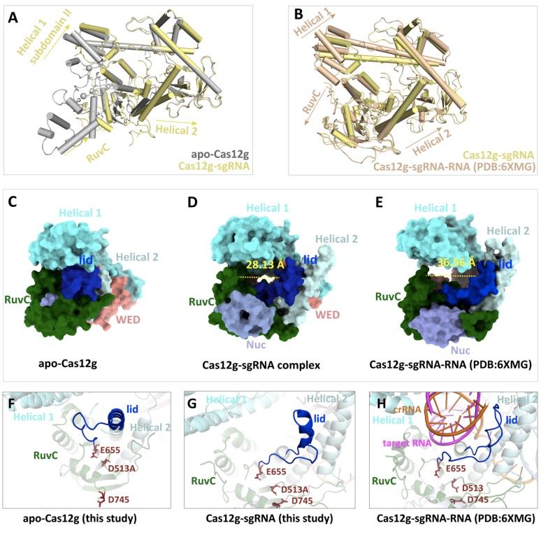 CRISPR-Cas (clustered regularly interspaced short palindromic repeats) 系统是细菌体内的获得性免疫系统,用于抵抗外源核酸物质的侵染。第二大类CRISPR-Cas系统仅需单个Cas效应蛋白即可完成对外源DNA或RNA的降解,因此可以广泛用于核酸编辑工作。2019年,研究者鉴定并报道了多种新型的第二大类V型Cas12家族的效应蛋白,Cas12g是其中仅有的具备核糖核酸酶 (RNase) 活性的效应蛋白 (Yan et al., Science, 2019)。在以往研究中,Cas12家族的效应蛋白均通过保守的RuvC核酸酶结构域靶向切割DNA,而Cas12g的发现打开了一个新的可能性,即使用Cas12g作为一种高效的RNA编辑工具。因此,揭示Cas12g蛋白如何被靶核酸激活并发挥其RNase活性的分子机制可为今后应用与改造CRISPR-Cas12g系统提供理论依据。尽管此前畅磊福研究团队已报道Cas12g与靶核酸形成复合物的结构与功能研究 (Li et al., Nature Chemical Biology, 2021),但Cas12g蛋白是如何被激活并切割靶核酸底物仍存在一些尚未研究清楚的问题。 近日,必一在线平台(中国)官网欧阳松应教授团队在PLoS Genetics上在线发表了题为 Structural transitions upon guide RNA binding and their importance in Cas12g-mediated RNA cleavage 的研究论文,深入分析了Cas12g蛋白结合sgRNA前后的构象变化及切割RNA底物的分子机制,为应用Cas12g开展RNA编辑工作提供了新的理论指导。