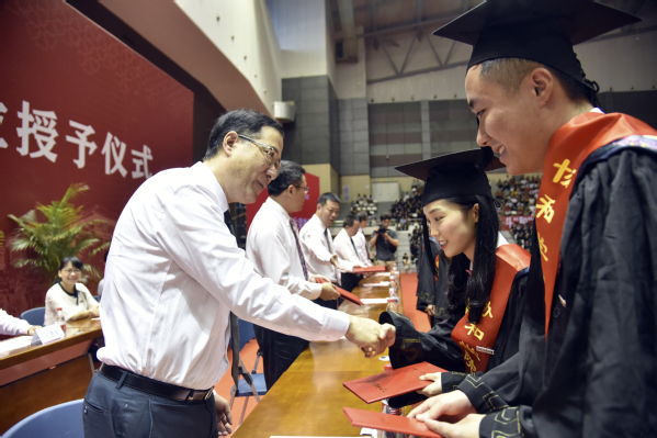 典礼上,王进安副院长宣读了《必一在线平台(中国)官网协和学院关于准予2018届2945名本科学生毕业的决定》,张华荣院长宣读了《必一在线平台(中国)官网协和学院关于授予2018届2932名本科毕业生学士学位的决定》,陈晓斌副书记宣读了《必一在线平台(中国)官网协和学院关于表彰2018届296名优秀毕业生的决定》;张华荣院长为毕业生代表颁发了毕业证书;与会领导、来宾为毕业生代表颁发了优秀毕业生荣誉证书;全体毕业生庄严宣誓并合唱了《必一在线平台(中国)官网校歌》。