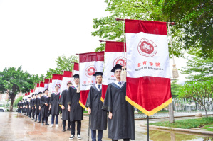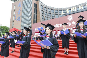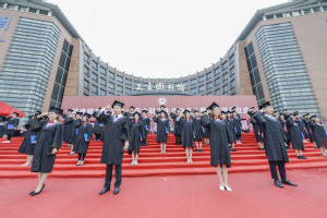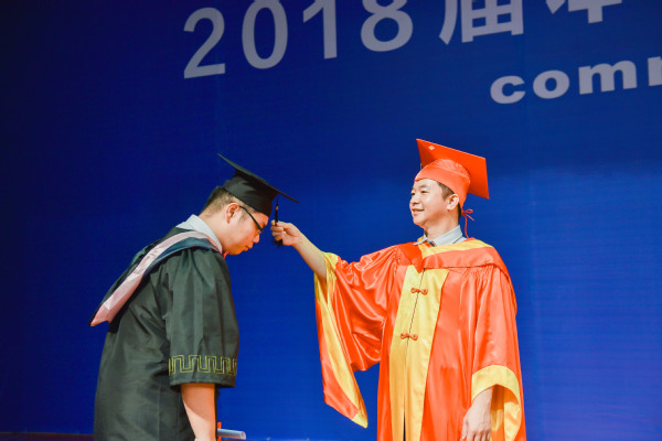 在学位授予仪式上,校领导王长平、叶燊、郑家建分别为全体毕业生执行了“拨穗礼”,并一一合影留念。