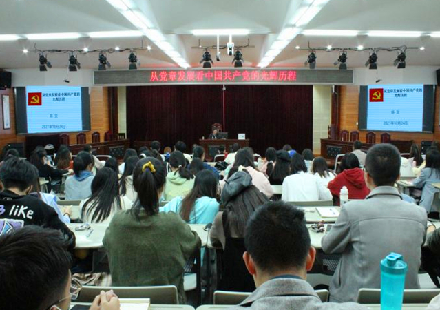 近日,法学院党委书记陈文为学院学生党员和入党积极分子讲授了一堂以“从党章发展看中国共产党的光辉历程”为主题的党课。