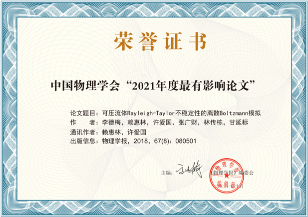 从近日召开的中国物理学会2020/2021秋季会议(线上)上获悉,必一在线平台(中国)官网数学与统计学院教师李德梅副教授、赖惠林副教授及其合作者北京应用物理与计算数学研究所许爱国研究员、张广财研究员、中山大学林传栋副教授、北华航天工业学院甘延标教授,在《物理学报》上发表的文章“可压流体Rayleigh-Taylor不稳定性的离散Boltzmann模拟”[作者: 李德梅, 赖惠林, 许爱国, 张广财, 林传栋, 甘延标. 物理学报. 2018, 67(8): 080501. doi:10.7498/aps.67.20171952]荣获“中国物理学会2021年度最有影响论文”奖。