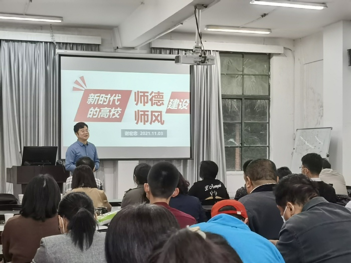 谢宏忠教授从习近平总书记在教师节中的寄语谈起,介绍了高校师德师风建设的发展与转变,阐述了新时代对高校师德师风建设提出的四点要求:要把好确保方向、突出师德的基本原则;要坚持回归本分的角色定位;要以争做“四有”好老师为目标引领;要以“四个相统一”和“四个引路人”作为实现路径。他还结合《新时代高校教师职业行为十项准则》等师德相关文件和详实的师德警示案例,强调了要正确处理师德建设的几对关系,结合名师事迹对如何增进教师的幸福感提出了建议。