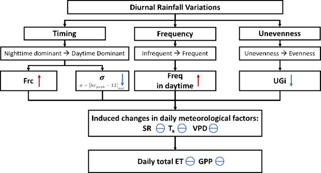 图2 概念图,表达降雨时间、频率和分布不均衡性变化引起的气象因子变化,以及随之而来的GPP和ET日总量的变化。向上的箭头表示增加,反之表示减少。正、负号分别表示增加和减少。