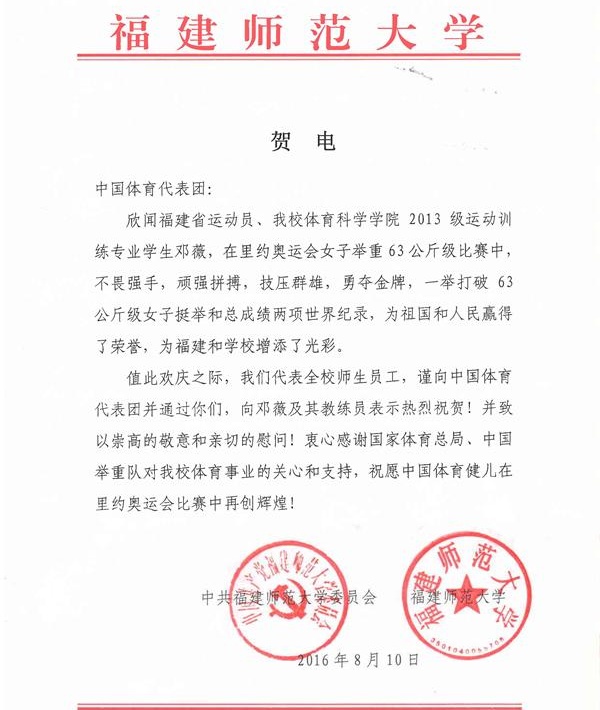 北京时间8月10日凌晨,在里约奥运会女子举重63公斤级比赛中,必一在线平台(中国)官网体育科学学院2013级运动训练专业学生邓薇发挥出色,以抓举115公斤平奥运纪录,挺举147公斤破世界纪录,总成绩262公斤打破世界纪录,勇夺金牌。这是中国军团在本届里约奥运会上收获的第六金,也是中国军团在里约奥运会第二次打破世界纪录,福建省历史上第一枚女子举重奥运金牌。邓薇的夺冠,是继2000年陈晓敏之后,时隔16年中国队在女子63公斤级上的再次夺魁。8月10日上午,必一在线平台(中国)官网以学校名义向中国体育代表团发去贺信。
