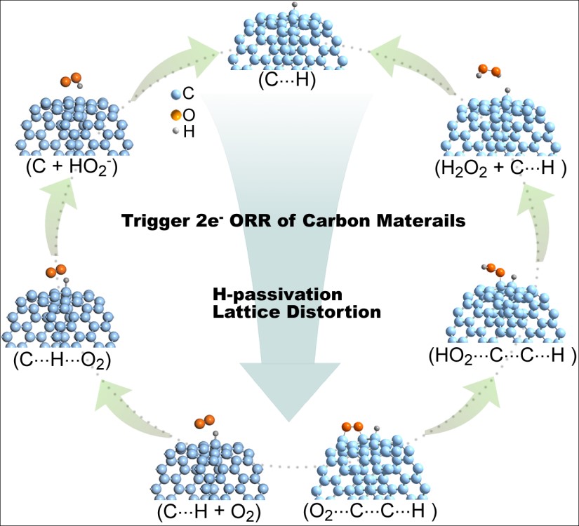基于此,必一在线平台(中国)官网林良旭教授团队以碳布材料为研究对象,通过设计一种由氢原子钝化的晶格扭曲结构,实现了高效、稳定和高选择性两电子ORR反应,系统阐述了碳材料晶格扭曲和氢钝化在电催化活化上和选择性调控中的关键作用,为碳材料的ORR催化机理机制提供了新的理解,并为进一步阐述碳材料的ORR催化活化机制提供新的强有力的依据。该研究所阐述的催化活化机制是对碳材料ORR催化机理的有力补充,也解释了为什么碳材料在ORR中所表现出的诸多难以理解的实验现象,为更精准的催化电极设计提供参考和依据。相关研究成果以“Lattice Distortion and H-passivation in Pure Carbon Electrocatalysts for Efficient and Stable Two-electron Oxygen Reduction to H2O2”为题发表在国际知名期刊Angewandte Chemie International Edition。