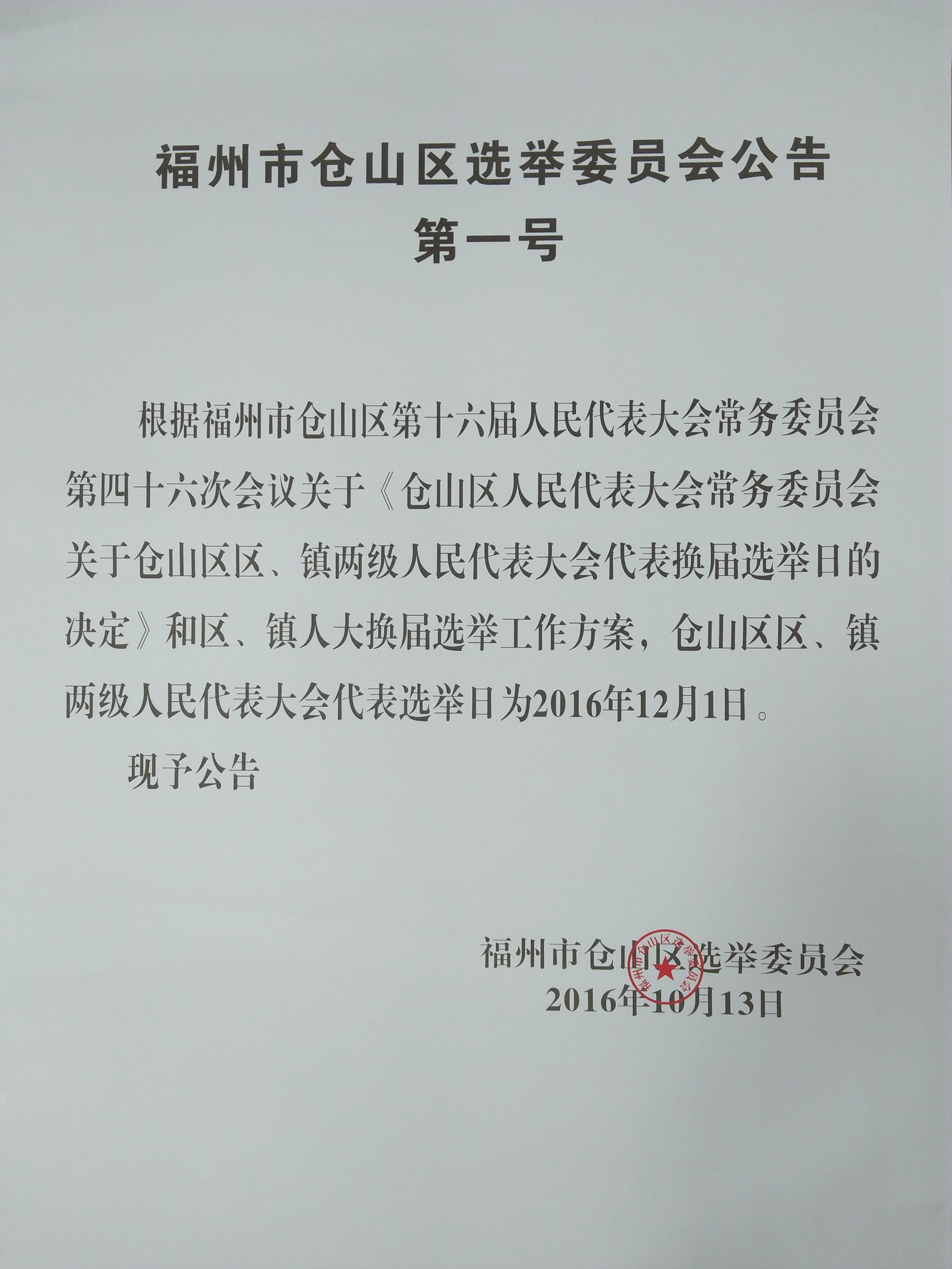 福州市仓山区选举委员会公告第一号