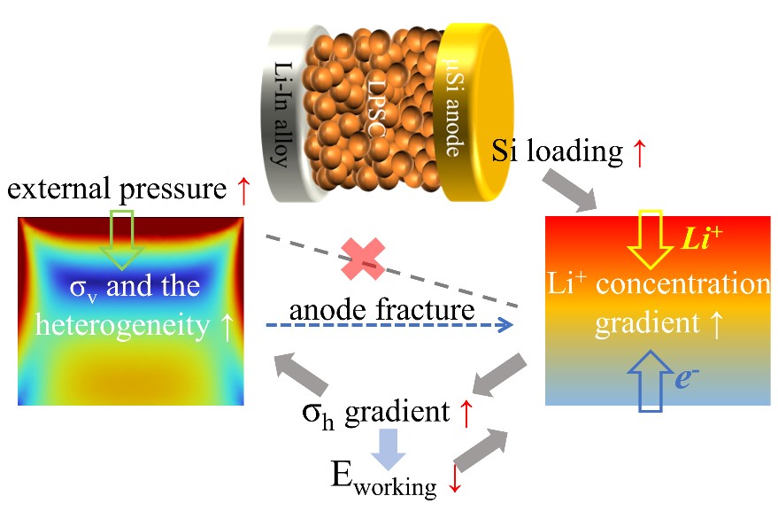 含有硅负极的全固态电池被认为是克服金属锂负极所面临挑战的一类极具潜力的电池体系。然而,在该体系中,硅负极往往需要被施加较高的外加堆叠压力才能实现稳定循环。此外,外加压力与电池性能之间的关联以及硅负极的失效机制尚不明确,这些问题严重阻碍了硅基全固态电池的性能优化和实际应用。基于此,必一在线平台(中国)官网林应斌教授团队基于堆叠压力耦合电化学-力模型,系统探究了硫化物固态电池中微米硅负极的储锂和失效机制,从实验和模型双维度上揭示了不同负载量和不同外加压力下硅的锂化动力学、形态演化和电池性能衰减的机制,并指出保障低的锂离子浓度梯度是实现硅负极在低外加压力下稳定工作的关键。这项工作为硅负极在全固态电池中的储锂机制和性能提升提供了一定的参考,并为下一代高性能电极的开发提供了潜在的方向。