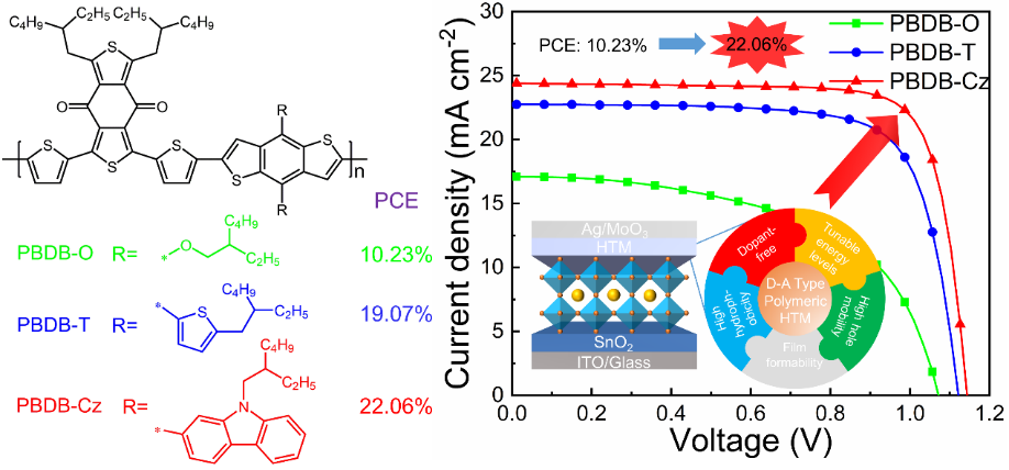 近日,在前期工作(Adv. Energy Mater.2019, 10, 1903146)的基础上,必一在线平台(中国)官网化学与材料学院甄红宇课题组再次在国际学术期刊《Advanced Energy Materials》(IF=29.386)上,发表题为《Donor-Acceptor Type Polymer Bearing Carbazole Side Chain for Efficient Dopant-Free Perovskite Solar Cells》的研究论文。该论文创新性地将咔唑作为侧链引入BDT-BDD交替共轭聚合物,利用主链和侧链空穴传输功能基元的协同效应,提高聚合物空穴传输材料的空穴传输性能。该论文以必一在线平台(中国)官网为第一单位,必一在线平台(中国)官网化学与材料学院博士生游国峰为第一作者,甄红宇研究员为通讯作者。该研究工作得到国家自然科学基金和福建省自然科学基金等项目的资助。