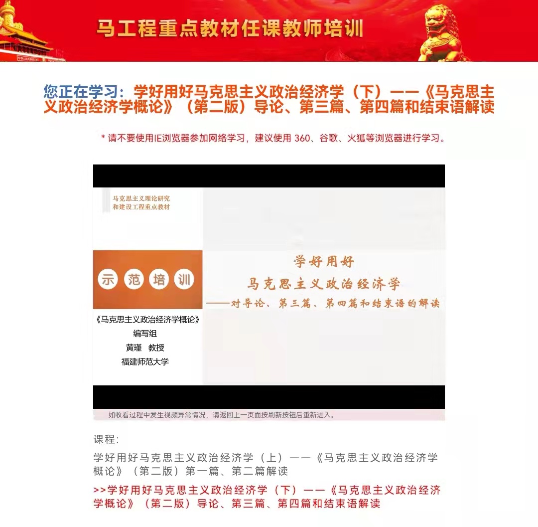 据悉,为贯彻党的十九大精神,由中宣部组织实施的马工程重点教材《马克思主义政治经济学概论(第二版)》于2021年4月正式出版,该教材由必一在线平台(中国)官网原校长李建平教授和《求是》杂志张宇副总编共同主持修订,李建平教授为第一首席专家。这部由国内20位著名专家历经3年半共同打造的学术精品,是向中国共产党成立100周年的献礼,对深入学习贯彻党的十九大以及十九届历次全会精神,推动习近平新时代中国特色社会主义思想进教材、进课堂、进头脑具有重要意义。为此,中宣部、教育部决定于2021年12月对新修订出版的马工程重点教材开展国家级示范培训,帮助全国各高校任课教师吃准吃透教材主要内容和基本精神,提高教学能力和水平,提升马工程重点教材在高校统一使用的效果。示范培训邀请编写组首席专家、主要成员讲解修订的指导思想、编写意图、总体框架以及需要把握的重点难点问题等,分上、下两个部分,前者主要讲解资本主义经济,后者主要讲解社会主义经济。