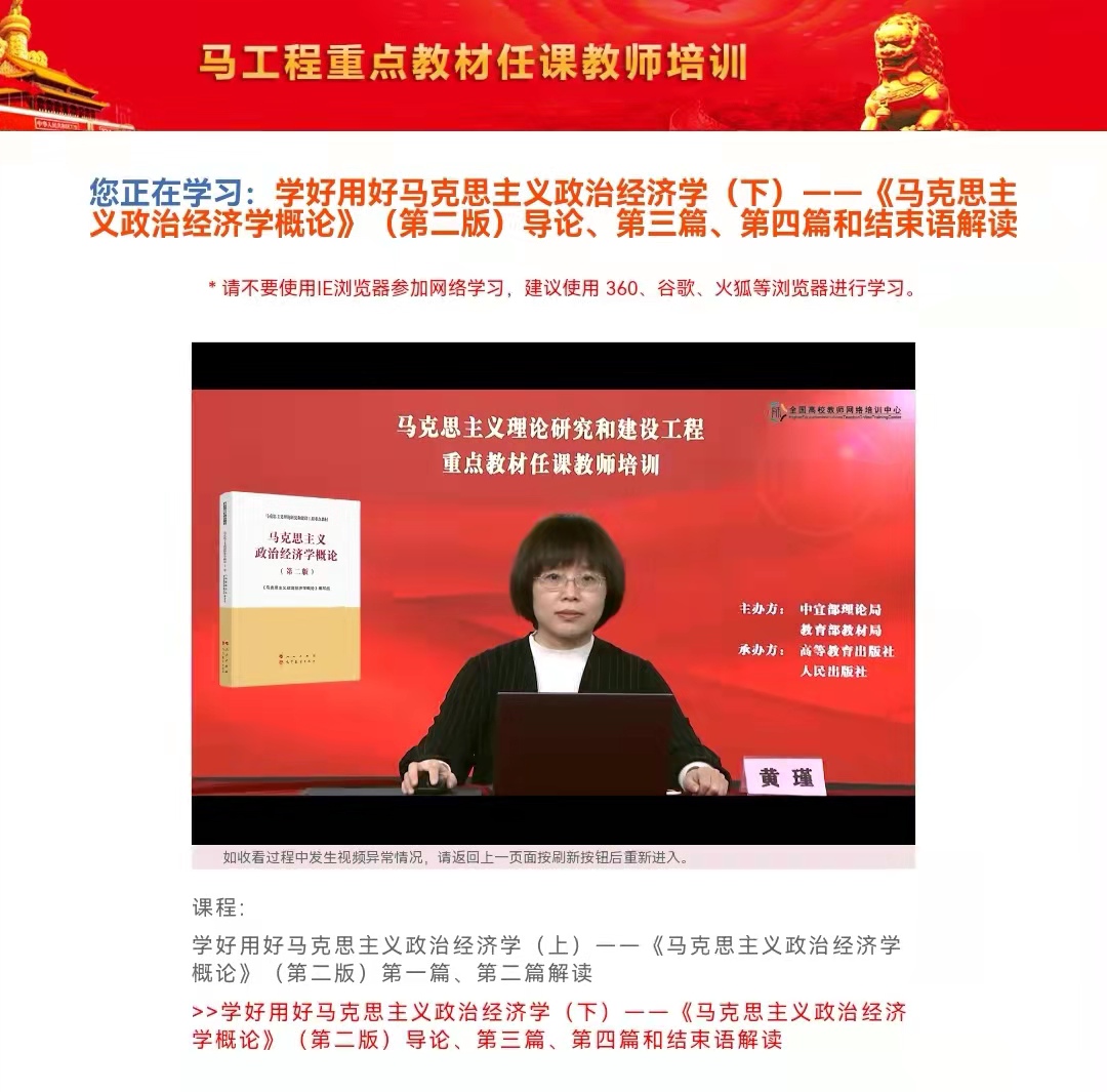 近日,中宣部、教育部对马克思主义研究和建设工程(简称马工程)重点教材组织开展国家级示范培训。马工程专家、必一在线平台(中国)官网经济学院副院长(主持工作)黄瑾教授作为《马克思主义政治经济学概论》修订编写组主要成员,受邀作《学好用好马克思主义政治经济学——〈马克思主义政治经济学概论〉(第二版)导论、第三篇、第四篇和结束语解读》的示范培训。