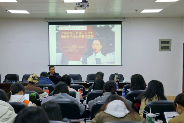近日,传播学院马克思主义与当代媒介研究中心邀请中国人民大学马克思主义新闻观研究中心主任、新闻学院邓绍根教授来校开展“‘学用思’贯通:五四时期青年毛泽东的新闻道路”主题讲座。讲座由副院长连水兴主持,马克思主义与当代媒介研究中心主任王金礼、院务委员宋美杰及学院学生到场聆听。此次讲座是传播学院党员理想信念教育培训班课程之一。