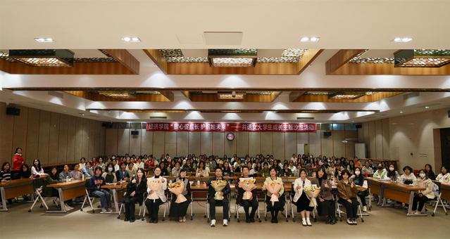 12月6日,经济学院“暖心促成长 护航她未来”共话女大学生成长主题沙龙在旗山校区宏达厅举行。院党委副书记叶龙祥、关工委主任林子华教授、工会主席陈晓枫教授、工商管理系王珍珍教授,全体辅导员及2023级女大学生代表共150人参加了活动。