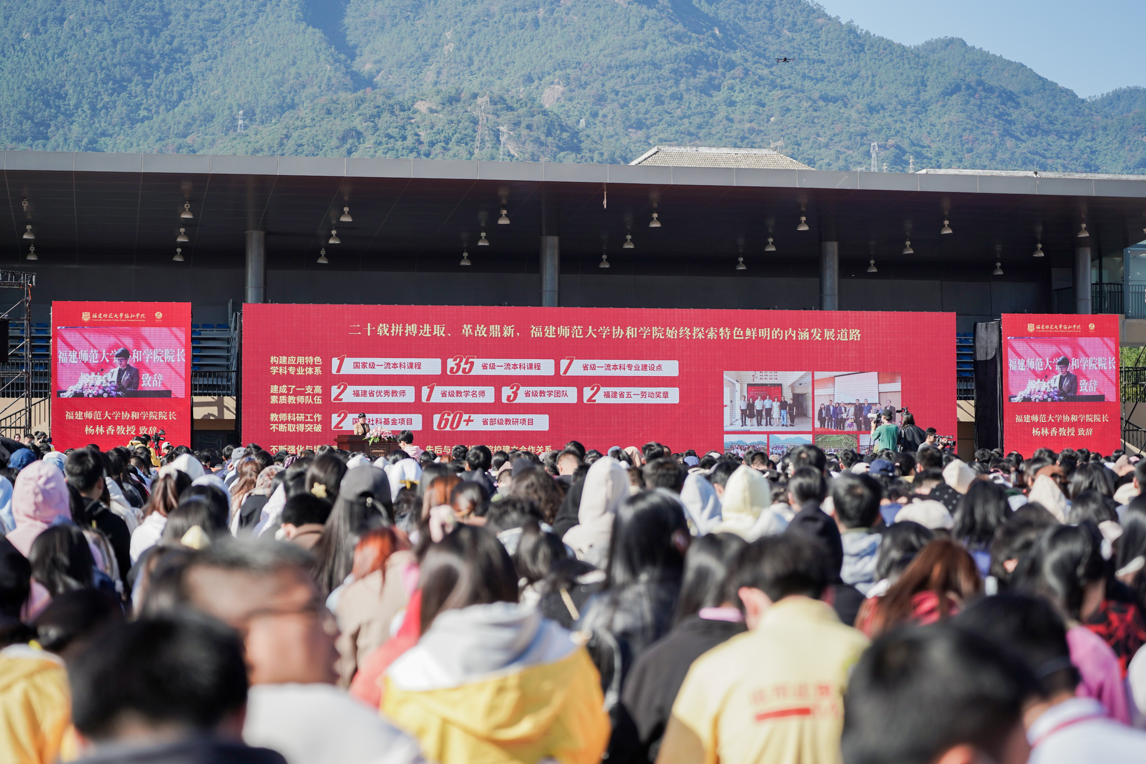 协和学院院长杨林香作题为《廿载黉宇弦歌不辍 协力同心再谱华章》的大会致辞。她回顾了协和学院的办学历程,总结了二十年的办学成就。她指出,协和学院始终坚持与国家战略和时代发展同频共振,始终探索特色鲜明的内涵发展道路,始终致力于培养“实基础、高素质、强技能”的应用型人才,建成了一所被社会认可的应用型综合大学,为区域经济社会发展作出了积极贡献。她表示,站在新起点,协和学院将立足“两个大局”,胸怀“国之大者”,着力夯实“以专业建设为核心、以应用型发展为导向、以文化育人为内涵”的三大办学根基,深入实施“质量立院、特色建院、人才强院、服务兴院”四大发展战略,为实现“高水平、有特色、省内一流、全国知名的独立学院”的办学愿景而努力奋斗,为教育强国建设、民族伟大复兴伟业作出新的更大贡献。