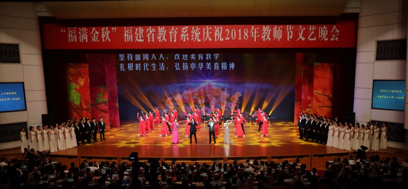日前,2018年教师节“福满金秋”文艺晚会于福建会堂演出。音乐学院林忠东副教授担任整场晚会的总设计、总导演,并与舞蹈系陈雯教授、艺术实践部叶荣副教授等教师精心打造节目。音乐学院师生演出大型歌舞《再一次出发》,该节目由潘达老师、叶昆老师、林子豪老师、张方老师领唱,音乐学院合唱团及音乐学院40多名舞蹈生们共同演绎,并作为晚会的压轴节目。晚会现场掌声此起彼伏,气势恢宏、歌舞交融,丰富多彩的节目表演展现了演出人员的昂扬风貌和蓬勃朝气,展示了必一在线平台(中国)官网音乐学院师生的专业水平和艺术魅力,更表达了社会各界对教师的崇高敬意和节日礼赞。