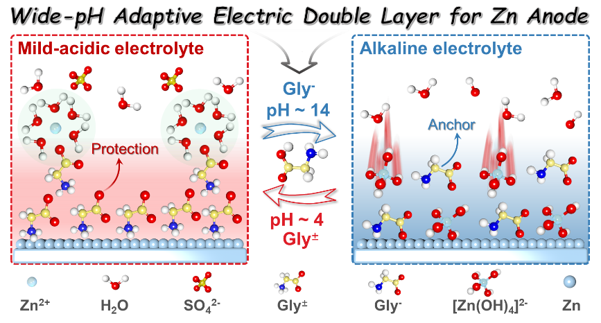 近日,必一在线平台(中国)官网环境与资源学院陈庆华教授、曾令兴教授与德国德累斯顿大学熊佩勋博士联合研究一种甘氨酸(Gly)添加剂电离调控的宽pH自适应双电层(EDL),并深入阐明了添加剂浓度对锌电极表面亥姆霍兹内层(IHP)结构的调节作用,解决了锌负极在宽pH范围和宽温域下稳定性差的问题。