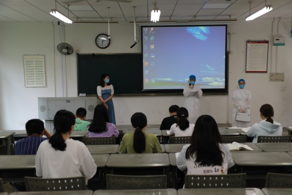 医生和护士在旗山校区教室进行新冠肺炎相关知识宣教