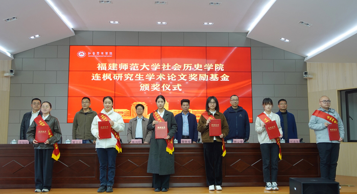 近日,社会历史学院举行2023年连枫研究生学术论文奖励基金颁奖仪式。校党委统战部副部长、校友会常务副秘书长黎胜禄,社会历史学院党政领导班子,教师代表,全体辅导员及获奖学生参加了活动。