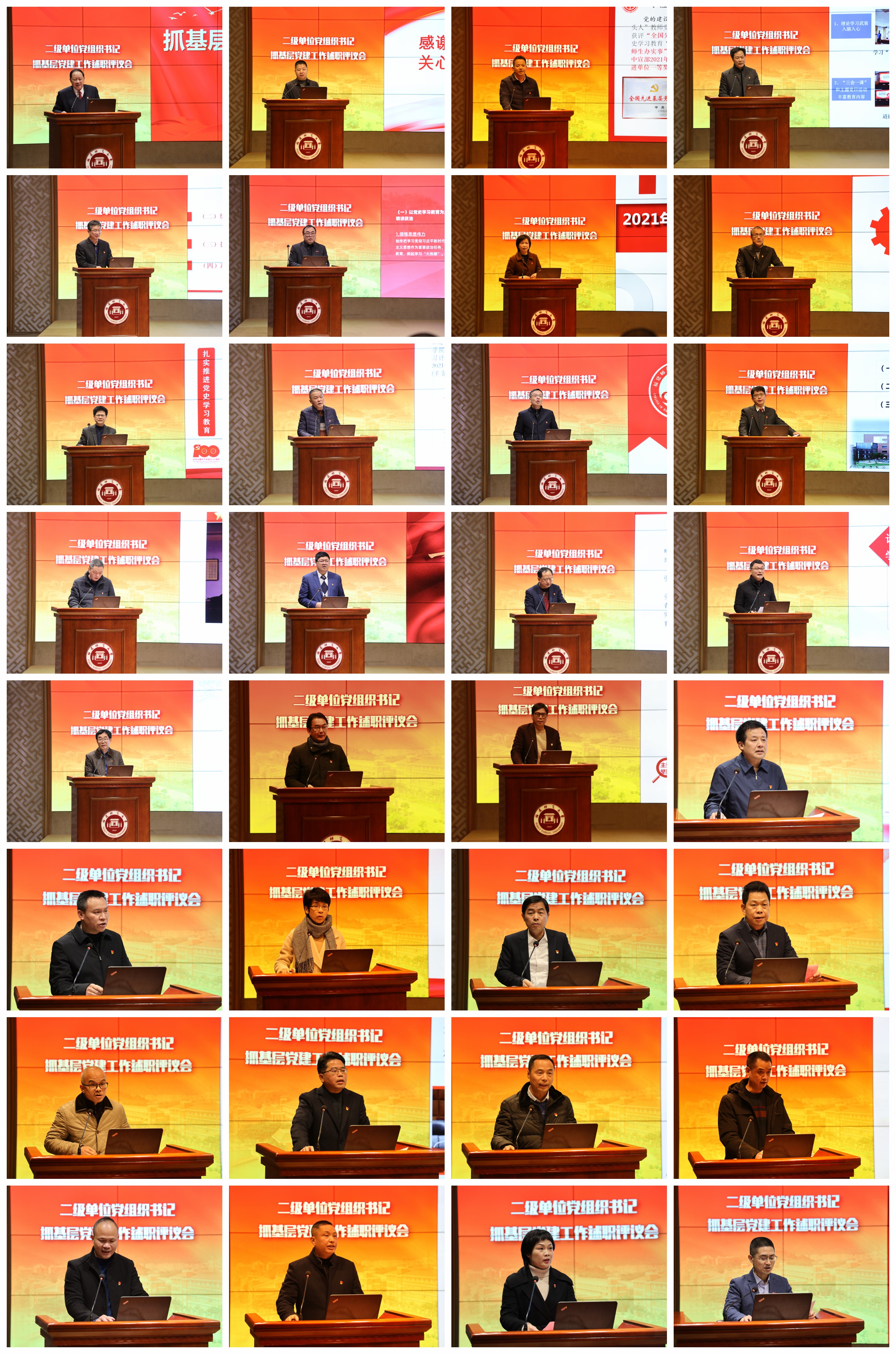 会上,全校32名二级单位党组织负责人作会议述职,与会人员对述职人员的履职情况进行民主评议。