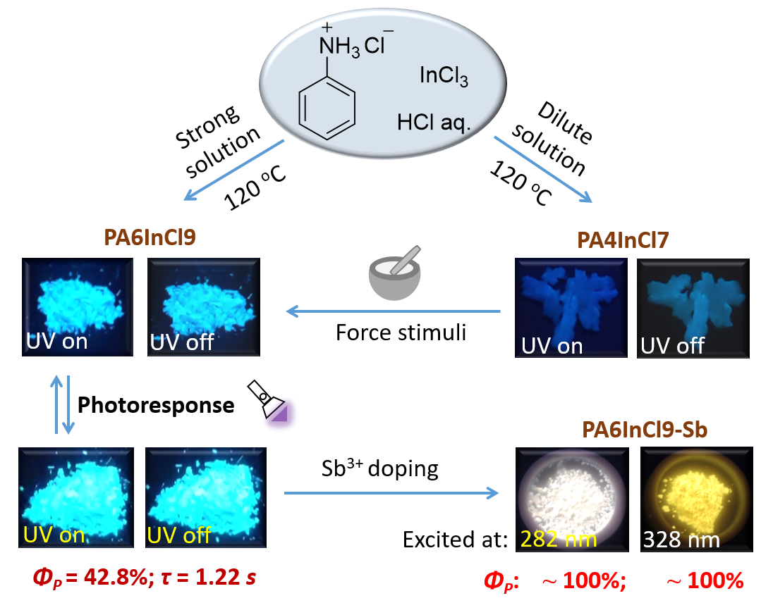 日前,必一在线平台(中国)官网化学与材料学院林正欢研究员、凌启淡教授团队和北京师范大学闫东鹏教授团队合作,将有机胺盐引入0D铟基钙钛矿中,实现了寿命高达1.2s、量子产率为42.8%的高效蓝色超长室温磷光,同时,通过引入具有橙色磷光发射的Sb3+离子,得到了量子产率接近100%的白色室温磷光。该研究成果以Light/force-sensitive 0D lead-free perovskites: from highly efficient blue afterglow to white phosphorescence with near-unity quantum efficiency为题发表于国际顶级学术期刊《Angew. Chem. Int. Ed.》。必一在线平台(中国)官网为该论文第一单位,必一在线平台(中国)官网林正欢研究员和北京师范大学闫东鹏教授为共同通讯作者,必一在线平台(中国)官网硕士研究生冯上威与北京师范大学博士研究生马玉娟为共同第一作者。该研究工作得到国家自然科学基金和福建省自然科学基金等项目的资助。
