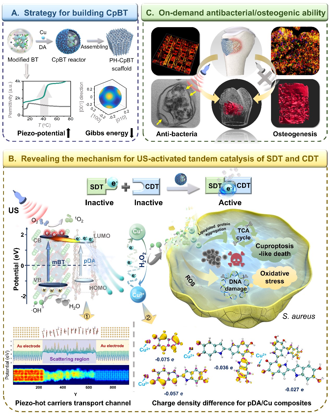 为了解决骨植入体感染问题,必一在线平台(中国)官网光电信息与工程学院张先增教授团队基于前期对压电声敏剂的超声-压电调控机理的工作(Adv. Func. Mater., 2023, 33: 2210726),进一步提出了一种超声激发的压电智能纳米反应器。该纳米反应器通过超声触发的时空串联催化,提升了声动力疗法和化学动力疗法对骨植入物细菌感染的治疗效果。该纳米反应器利用高性能压电钛酸钡、聚多巴胺和铜离子的巧妙配合,使超声激活的压电热载流子经聚多巴胺“电子通道”转移到铜上。这不仅促进了压电声动力活性氧物质的生成,还调节了Cu2+和Cu+之间的价态转换,从而触发Cu+催化的类芬顿反应,促进羟基自由基的生成,导致细菌膜结构松弛和DNA损伤。将该纳米反应器负载在3D打印聚醚酮酮骨植入支架表面,在医用超声作用下表现出优异的抗菌性能,同时在体内促进了植入体周围血管生成和骨生成,展现出了极佳的临床应用潜力。该策略有望为植入物提供超声可调控的抗菌和促骨能力,为治疗植入体感染提供一种新思路。