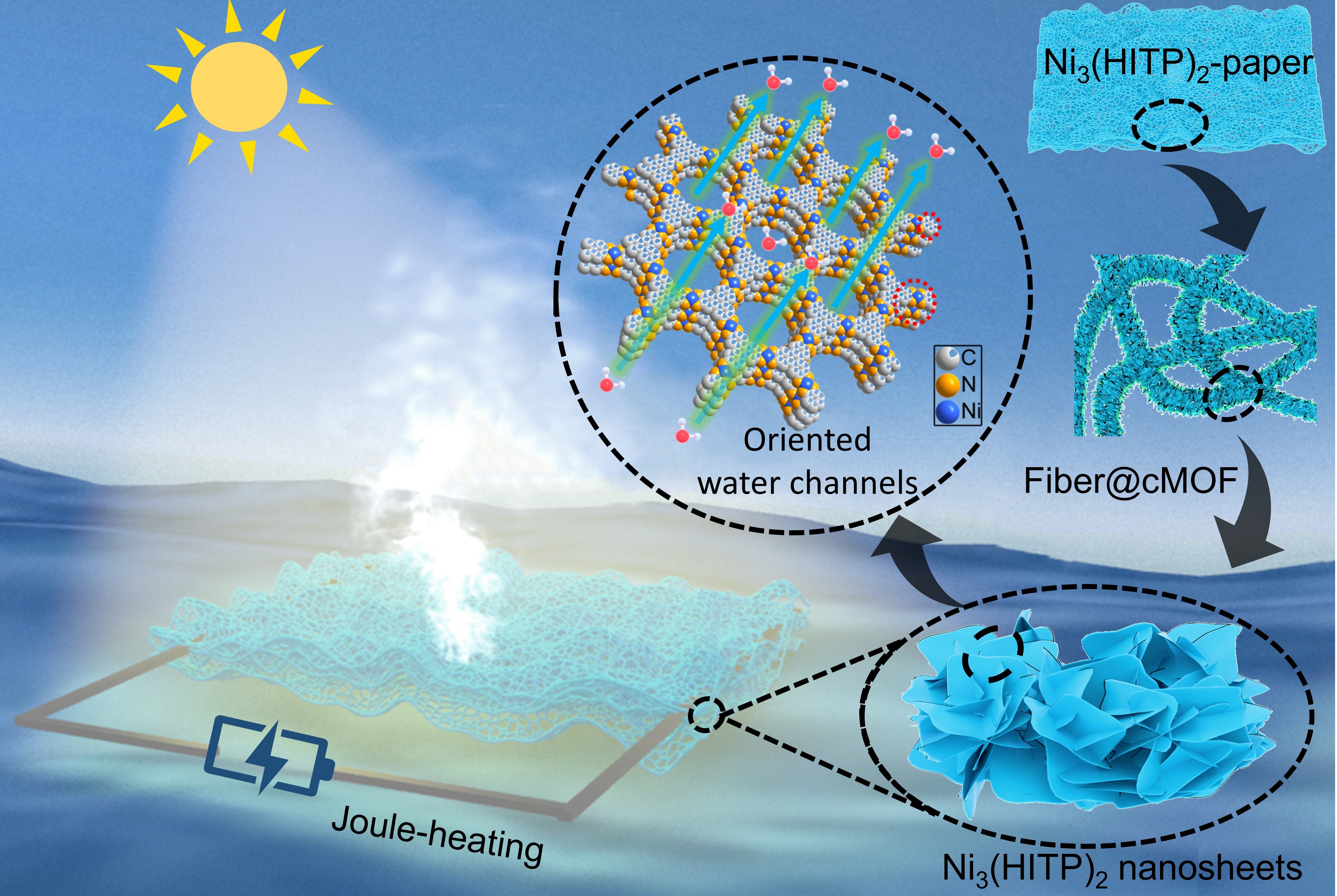 近日,必一在线平台(中国)官网物理与能源学院陈鲁倬教授与中科院福建物构所王观娥研究员合作,报道了一种具有分级宏观/微孔结构的导电金属-有机框架(MOF)的纳米片薄膜(Ni3(HITP)2-paper),并将其应用于高性能的界面海水蒸发。得益于其独特的亲水位点和疏水骨架通道结构,实现了低水蒸发焓(1676 J g-1)、高光热转换效率(96.25%)和优异的长期耐盐性。利用Ni3(HITP)2-paper协同太阳能光热和焦耳热效应,水蒸发速率被提升到2.60 kg m-2 h-1,超过了其他MOF基材料。这种具有分级宏观/微孔通道的纳米片薄膜的设计策略为电子、生物器件和能源应用提供了启发。该工作以“Conductive Metal–Organic Framework Nanosheets Constructed Hierarchical Water Transport Biological Channel for High-Performance Interfacial Seawater Evaporation”为题发表于Advanced Materials。