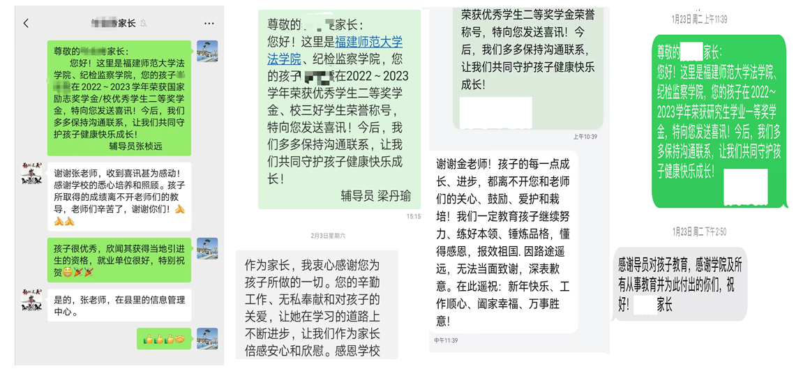 法学院、纪检监察学院强化家校联系,致力于协同家校育人工作。寒假期间,学院全体辅导员通过线上、线下方式,与学生家长进行深入沟通交流,确保家长能及时了解孩子在校的学习和表现,同时也从家长处了解学生的家庭情况及在家状态,推进家校育人同频共振,发挥学校、家庭对学生成长的叠加效应,共同促进学生全面成长。