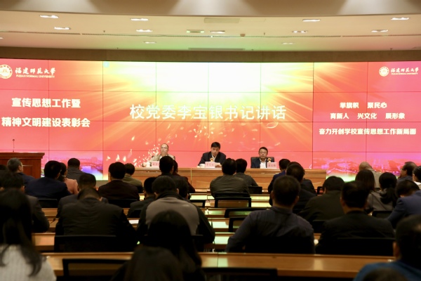 会议于11月22日上午在旗山校区宏达厅召开。校领导李宝银、潘玉腾、黄清波,机关各部处负责人,各二级单位党组织书记、分管宣传工作负责人、组织员、通讯员,校级新闻媒体记者代表,受表彰对象和学生代表约150人参加了会议。会议由校党委副书记潘玉腾主持。