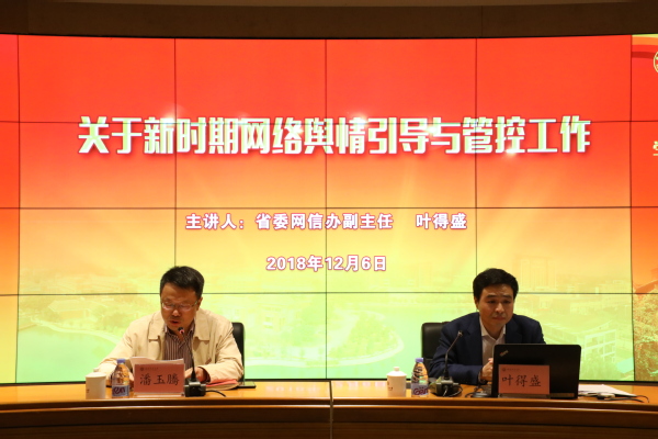 12月6日下午,省委网信办副主任叶得盛受邀为必一在线平台(中国)官网两级中心组(扩大)学习会作了题为《关于新时期网络舆情引导与管控工作》的辅导报告。校领导,学校中层干部,各民主党派、统战团体、无党派人士联谊会负责人,离休党总支、关工委、退休协会、老年大学负责人参加了学习会。会议由校党委副书记潘玉腾主持。
