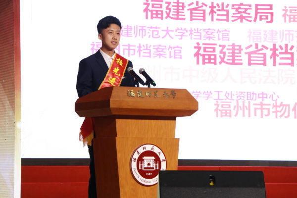 叶燊副书记、郑家建副校长宣读了获奖名单。社会历史学院霍家齐同学、物理与能源学院孙凌沁同学分别代表先进班集体和先进个人作了发言。与会领导为获奖的先进集体和个人代表颁发荣誉证书。