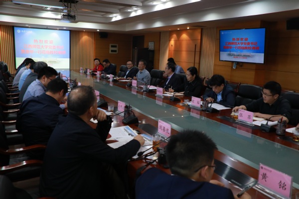 11月10日,江西师范大学党委书记黄恩华一行9人来校调研交流,校党委书记李宝银会见了黄恩华一行。调研交流会在旗山校区第二会议室举行,校领导王长平、陈晓红,以及对口职能部门负责人参加了交流会。