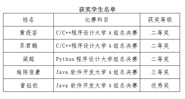 1114日,第十一届“蓝桥杯”全国软件和信息技术专业人才大赛全国总决赛落下帷幕。本次大赛中,数学与信息学院共有5位学生进入全国总决赛,最终取得3项二等奖、1项三等奖、1项优秀奖的优秀成绩。