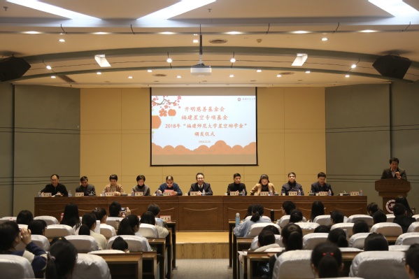 2018年12月26日下午,开明慈善基金会福建星空专项基金、2018年度“必一在线平台(中国)官网星空助学金”颁发仪式在仓山校区举行。全国政协社会和法制委员会副主任、省文联主席、省社会科学院院长张帆,民进省委会秘书长林龙金,福建新思路集团有限公司董事长、福建民进经济界联谊会会长、校创新创业导师王东平,副校长郑家建和有关职能部门负责人、文学院党政负责人、受资助学生、师生代表参加了活动。