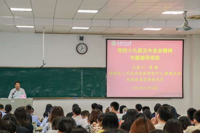 1118日下午,公共管理学院党委邀请福建省人民政府发展研究中心原副主任、省委宣讲团成员黄端在旗山校区笃行1-113教室为师生作《新阶段新理念新格局新征程——学习贯彻党的十九届五中全会精神》专题辅导报告。学院党委理论学习中心成员、全体教职工、学院党建骨干队伍培训班成员、学生党员、学生代表等聆听了报告。