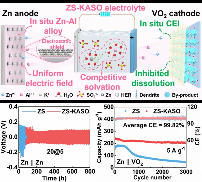 Professor Zeng Lingxing, a member of the Chen Qinghua & Qian Qingrong team at the College of Environmental and Resources, along with Academician Chen Jun’s team from Nankai University, has introduced a multifunctional alum electrolyte additive. This additive synchronizes the in-situ construction of protective layers on both the Zn anode and the VOx cathode, effectively stabilizing the zinc (Zn) metal anode and the vanadium oxide (VOx) cathode simultaneously. By combining experimental and theoretical calculations, a Zn-Al alloy layer forms on the Zn anode, creating a homogeneous electric field to mitigate dendrite formation. The stronger van der Waals forces between high-valence Al3+ ions and water molecules allow Al3+ to compete with Zn2+ for solvation, significantly reducing side reactions. The Al-containing cathode-electrolyte interface helps prevent the irreversible dissolution of the VOx cathode and the accumulation of byproducts. This study adopts a simple electrolyte additive strategy to address instability issues on both electrodes, providing a new approach to developing cost-effective zinc-based batteries. The research was published in Angew. Chem. Int. Ed., a leading journal in the field of carbon neutrality, under the title "Synergistic Regulation of Anode and Cathode Interphases via an Alum Electrolyte Additive for High-performance Aqueous Zinc-Vanadium Batteries."