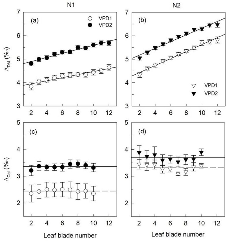 The research team targeted Cleistogenes squarrosa, a perennial C4 grass, and conducted a two-factor interaction experiment in controlled experiments with different levels of vapour pressure deficit and nitrogen supply. The differences in δ13C of leaf bulk organic matter and cellulose revealed post-photosynthetic fractionation effects of progressively depleted 13C with leaf age classes. The research team also modeled the leaf carbon flux and post-photosynthetic fractionation, attributed to fractionation effects caused by respiration and photosynthate output. Considering that young mature leaves and cellulose are less affected by post-photosynthesis fractionation effect and have consistent environmental response characteristics, the authors suggest that young mature leaves or cellulose should be used as research materials in related studies, and that the potential influence of leaf age effect should be paid attention to during sampling.